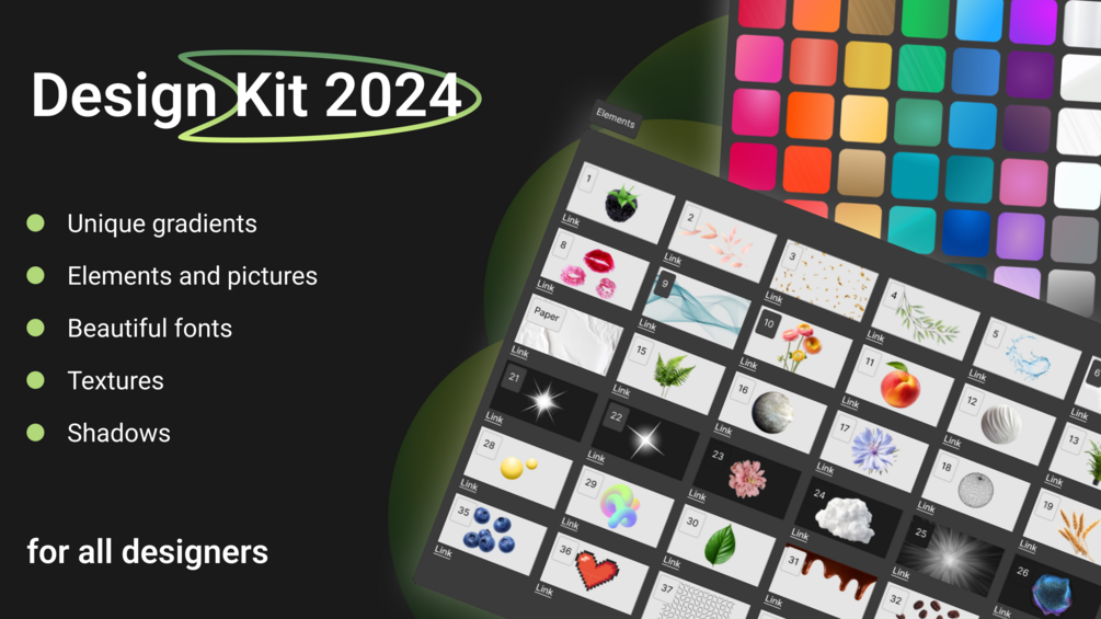 I'm thrilled to introduce a comprehensive toolkit that I've crafted to streamline your design work. This toolkit features an assortment of unique gradients handpicked by me, my go-to fonts, a variety of textures suitable for almost any project, classic shadows, and a range of design elements such as 3D shapes, greenery, and flowers perfect for backgrounds, among others. I aim to decrease your workload, simplify your process, and amplify the joy in your work.